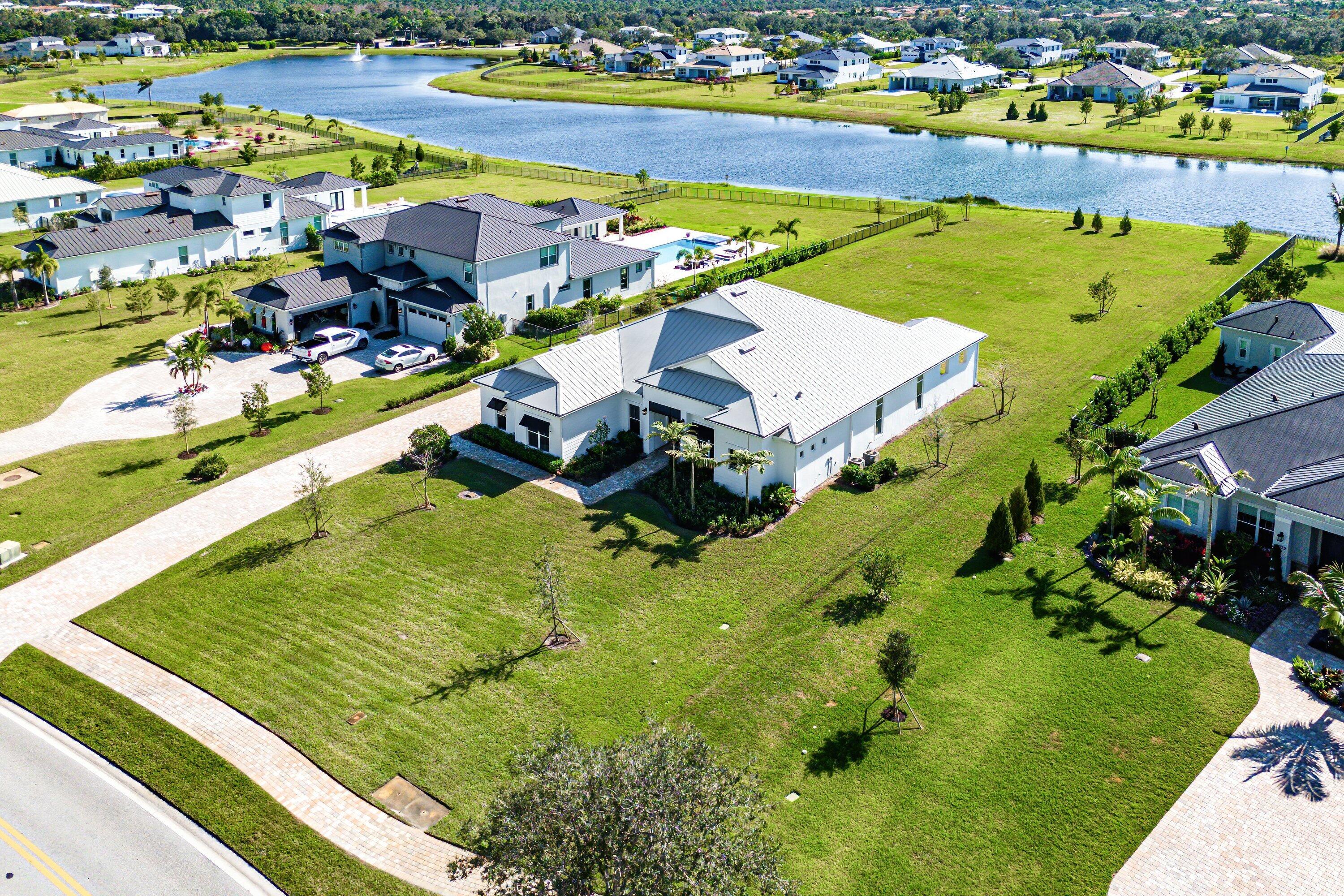Single story Oakley home with lake views on a just shy 1 acre homesite in an exclusive, high end community. This brand new residence has never been lived in and offers a desirable open concept layout, perfect for both everyday living and entertaining. The home has been professionally staged is offered furnished as seen. A dramatic zero corner sliding door set opens all the way to allow full indoor outdoor living and floods the home with natural light. Beautiful engineered hardwood and tile floors run throughout, complemented by contemporary, high end light fixtures for a sleek, modern feel.The gourmet kitchen is a true showpiece, featuring: " KitchenAid gas cooktop " Three ovens ideal for large family gatherings and entertaining " Soft close drawers and cabinetry " Large walk in pantry With 4 bedrooms, and a flex room that can function as a 5th bedroom, an office, a study, media room, or playroom and 3 baths, the floor plan is both functional and versatile. Bedrooms 2 and 3 share a convenient Jack and Jill bathroom, while a separate cabana bath provides direct access to the outdoor areaperfect for a future pool. An extended covered patio, pre wired and plumbed for an outdoor kitchen, enhances the outdoor living experience, offering a generous space for lounging, dining, and entertaining. The expansive just shy of 1 acre lot provides incredible potential to expand your private oasis with a guest house, resort style pool and spa, outdoor kitchen, or even a tennis/pickleball court. Prime location just 5 miles from the beach, surrounded by world class golf, boating, fishing, shopping, and scenic hiking and biking trails. Enjoy easy access to major highways and only about 25 minutes to Palm Beach International Airport (PBIA). A rare opportunity to own a new, never lived in luxury home with room to grow and customize to make this your forever dream home.